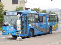 運河プラザ近くにある小樽運河工芸舎の前にある丸形ポスト撮影をしているとき、「小樽散策バス」が博物館前バス停に停車。停車していた中央バスは「小樽交通記念館」のペインティングバスでした。バス車体の中央は「しづか号」です。 |
