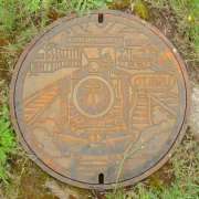 その後もセレモニーは続き、ゆっくりと「二人(義経号としづか号)」の撮影は当分できそうにないため、11時33分、交通記念館バス停から小樽散策バスに乗る。バスに乗る前、小樽交通記念館内にあるマンホールが昔の小樽駅構内とSLの絵だったので、デジカメ撮影する。 |