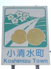 | 8:23 | 網走市と小清水町の境界に到達し、いつものとおり、カントリーサインをデジカメ撮影する。小清水町のはジャガイモとジャガイモの花です。てっきり原生花園の素敵な花かと思ってたので、意外でした。 |