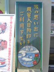 | 8:20 | 北浜駅から浜小清水方面に向かっていき、少し行ったところに北浜郵便局があり、局舎を撮影する。局前には「旅の思い出に風景入日附印をご利用下さい」と風景印の宣伝看板がありました。こういうのはいいですよね。そして看板の風景印自体も手書きなのがいいですね。でも、カラー表示になっているけど、実際はカラーじゃないんですよね(^^;(もちろん、トビ色の単色ですね)。 |
