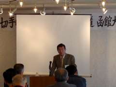 | 10:45 | 大会長の渡利函館支部長のごあいさつ、そして大会開催地の盾が渡利函館支部長から次回開催の札幌第一支部、大條支部長に渡され、大條さんからのごあいさつがあって、いよいよ「切手収集家のつどいin北海道」も終了。なお、今回のつどいについて、昨日の様子が今日付けの函館新聞の記事で載っていました。会場を出た直後、いろんな方々とごあいさつをして、会場をあとにする。今回のつどいは「非公式・HPによるつどい報告」係で、つどい中もパソコンでのHP更新作業をしていて、皆さんとお話する時間がちょっと少なくなりましたが、また皆さんとお会いできますね(^^)。そして、函館では毎年2月頃に一泊例会があるので、来年に行われるときには、また参加したいですね。 |