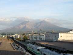 | 15:37 | 森駅で降りる。駅の高架橋の窓から駒ヶ岳がしっかりと見れました。 |