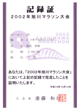 | 9:30 | いよいよスタート。スタートはフルマラソン、ハーフマラソン同時なので、先頭は自衛隊所属のハーフ出場者。この日の天候は秋晴れで、気温も秋にしては高めと絶好のマラソン日和。前のフルマラソン、千歳日航国際マラソンでは前半抑えすぎて、後半にペースをあげたものの、スタミナ切れと足の不調で、33km地点から大きくペースダウンし、3時間16分と「失敗レース」でしたので、今回は無理はしないものの、前半は早めに走って、ちょっと「貯金」をつくり、後半はなんとか粘って、今度こそ3時間を切るタイムでゴール…という作戦。スタートしてからはハーフの選手の早いペースにつられるように、やや早いペース。それでも、オーバーペースぎみになったところで、ペースを抑える。 その後、5km手前で数人の集団が私にとっていいペースで走っていると思い、その集団についていく。 15km地点は1時間00分06秒で通過。1kmほぼ4分ペース。このままのペースで行けば、2時間48分台…。そんなタイムはまず無理ですが、この調子なら3時間を切るタイムは体調的にも大丈夫と思っていた矢先、右足のアキレス腱痛に襲われる。途中、2度も立ち止まってアキレス腱のばしをするも、あまり状態はおもわしくなく、このまま走ればいずれは足がつってしまうかも…。フルマラソンはこのレースが今年最後で、せっかくの3時間を切るチャンスをパーにはしたくなかったので、走法を大胆修正し、歩幅を狭めて足の負担を少なくするピッチ走法に切り替える。ややペースは落ちるものの、大幅に落ちることなく走り、右足アキレス腱の痛みもそれほど出ない状態に。どこまでその走法で行けるかわからないけれど、行けるところまで行ってみる。 折り返し地点(21km過ぎ)、足の痛みもだいぶ気にならなくなり、自分の順位を確認すると、39歳以下の部門では14位。10位以内に入れば入賞で、賞状とトロフィーがもらえるのですが、入賞は全く狙わず、とにかく3時間を切ることだけを目標に走り続ける。途中、同じ市役所のマラソン同好会の方を見つけては手をあげて「あいさつ」(お互いに頑張りましょう!というアクションですね)をする。 30km手前から、スタミナがだいぶ消耗して、ピッチ走法することが難しくなったところで、いつものような走りに戻す。アキレス腱痛もほとんど出なくなる。30kmを過ぎた地点で残り12kmちょっとを1km4分半ペースで乗り切れば、3時間を切るタイムでゴールができる…ただし、30kmを過ぎてから、ピッチ走法をした影響で、ペースそのものも落ちてくる。残り5kmのところで3時間まであと22分50秒。まだ1km4分半ペースで行けば、2時間59分40秒でゴールできるものの、このあとペースは上がるどころが落ちていく。 40km地点では、できれば2時間50分を切って通過したかったのですが、2時間50分を35秒オーバーして通過。今のペースでは3時間を切るのが難しい状況。そして、残り1kmのところでは2時間56分03秒と3時間まであと3分57秒と4分を切ってしまう。このところ、1km約4分40秒ペースだったのに、あと1kmを3分56秒でないと3時間を切れない…。しかし、決して不可能な数字じゃないので、あきらめることなく、最後の力を振り絞ってペースを上げてゴールに向かう。 陸上競技場に入り、残りは350m。回りで「なんとか(3時間を)切れるぞ」などの声がかかる。もしかしたら、足が途中でつってしまうかも…と思いながらも、本当に今、持てる力を最大限出してゴールに向かう。第4コーナーを回ったところで2時間59分40秒を過ぎ、3時間まであと20秒足らず。このままだとゴールタイムは3時間切れるかどうかギリギリ。とにかく、3時間を切りたい、という一心でゴールに向かう。そして、ゴールラインを走り抜ける。ゴールラインを過ぎて1秒くらいのところでストップウォッチを止めたところ、「2:59’59’’47」の数字を刻んでました。タイムは私の今まで参加してきた経験から、2時間59分59秒か3時間00分00秒のどちらか…。で、ゴールしてすぐに完走証をもらうことができ、タイムを確認することができるので、完走証をもらったところ、「2時間59分59秒」と印刷されました。ついに念願の3時間を切って2時間台で走ることができました(^^)v。いわゆる「サブスリー」の仲間入りです。ただ、ゴールした時点では3時間ギリギリだったので、2時間台かどうか確信できない状態でゴールだったため、ゴールした直後はうれしさは全くなかったので、今度はせめて3時間を5秒でも切るタイムで、嬉しい気持ちを持ってゴールしたいですね(^^;。なお、順位は39歳以下の部門で13位でした。入賞は10位までで、入賞のボーダーラインまではあと1分半でした。ここまで来れば、いずれはフルマラソンでも入賞したいですね。 |