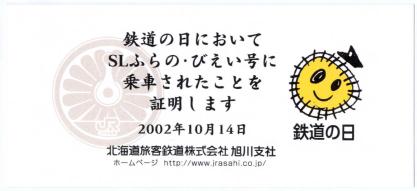 | 16:27 | 車掌さんのところに行き、乗車証明書をもらおうとしたところ、今日は「鉄道の日」ということで、今日限定の「2002.10.14鉄道の日記念乗車証」をもらいました。嬉しいような、通常の乗車証明書がもらえなかったので残念というか(^^;。 |