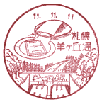 あと、「羊」の風景印使用局で、士別市では士別局と士別大通局の2局が紹介されてますが、士別局の全7局で「羊」入りの風景印を使用しています。図案説明では「羊」とはありませんが、「(士別)市のマスコットキャラクター」とあり、これが「羊」なのです。また、東月寒局でも羊ヶ丘展望台のクラーク像の後ろが図案説明にはないのですが、「羊」が描かれています。「羊」入りの北海道風景印リストについては、「yuaの日記録/2002年9月12日」に掲載しています。(2002.10.19提供) |