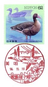 | ●宮島沼(2002年11月18日登録) 美唄局(〒072−8799美唄市) 美唄東一条北局(〒072−0012美唄市) 大富局(〒072−0057美唄市) 南美唄局(〒072−0822美唄市) ※すべてマガンが描かれている。 |