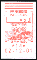 昨日は福岡日帰り旅行を敢行しました。で、新千歳空港内局、羽田空港局、福岡空港内局の3局で風景印の記念押印をしましたが、そのついでに3局すべてでメータースタンプ50円分を発行し、私製葉書にそれを貼付し、そのまま自分あて(札幌中央局私書箱)に差し出してきました。新千歳空港内局は朝差し出しで、同じ札幌圏ですので、当然私書箱に入ってました。で、13時35分に差し出した福岡空港内局からの葉書は到着し、それより早い羽田空港局からの葉書は12月2日20時45分現在ではまだ未着でした。羽田空港局からの差し出しは蒲田局経由となり、かなり処理に時間を要するため、配達日数がかかってしまうことが多いようですね…。せめて、空港内から差し出された郵便物は早く処理できる体制になれば便利なのですが…。(2002.12.5提供)