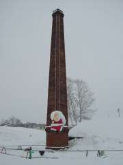 | 8:05 | 名寄駅から400m歩き、煙突のある(有)名寄土管製作所に到着。サンタ人形は一番下に取り付けられていました。人形には雪がかぶさっていました(^^)。これがクリスマス・イブの12月24日には煙突の一番上にあがるわけですね。煙突の下にはライトアップ設備もあり、クリスマス・イブの夜、煙突にライトアップされサンタ人形が上に来た状態は想像するだけで素敵ですね(^^)。煙突の上にはほんとに小さな木が生えてます。きっと煙突の上に鳥が止まり、木の種を運んだのでしょう。なお、ネットで検索すると、このサンタ人形は平成12年に名寄開拓百年を記念してまちづくりグループが制作。ですから、今年でサンタ人形は登場3年目ということですね。そして、2001〜2003年の春から秋まではサンタランドの広尾に貸し出され、シーサイドパークの開館中に設置され、来園者がサンタ人形の前で記念撮影するなど好評だそうです。 |
