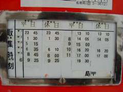 | 8:35 | サンタ人形を撮影したあと、今日も名寄郵便局に行って、風景印を押印する。そして、名寄局前にあるポストの集荷時刻をデジカメ撮影したのですが、1便目がなぜか「23:45」。この理由は不明ですが、あくまで郵便の処理は翌日という意味での表示なのでしょう。なお、23時45分の前の集荷時刻は平日が19:30、休日が17:00です。ゆうゆう窓口は24時間営業とはいえ、平日20時頃、休日が17時半頃に郵便運搬車が局を出たあとは翌日になってしまうため、23:45まで取り集めする必要がない、ということでしょう。それに、名寄なら数時間たってもポストに満杯の郵便が出されることはめったにないでしょうし、もし入りきらなければ、ゆうゆう窓口で出せばいいわけですので、問題なしですね。23:45の取り集めはもちろん、日付が変わるギリギリの投函まで当日の消印を押す、という体制にしているということですね。こういう表示ひとつを見ても、郵便処理の流れが少し見えてくるのが面白いですね。 |