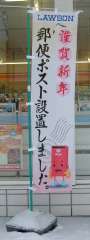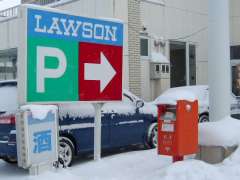 ですが、そういうところにもちゃんと店舗内に郵便ポストが設置されました。入口上には横断幕、そして入口横にはのぼりで「謹賀新年 郵便ポスト設置しました。」と2003年1月1日から全国のローソン全店舗内に郵便ポストが設置されました。で、江部乙局での風景印押印のついでに、国道12号線沿い、道の駅「たきかわ」近くのローソン滝川江部乙店に行きました。で、ここのローソンには元々店舗前に郵便ポストが設置されていました。 |