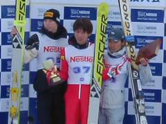 W杯メンバーの間に割り込んできた、1本目3位の東輝選手は110mを少し超えただけのジャンプ。113.5mと伸びなかったけど、得点は葛西選手を1点上回り、あと2人という状況で1位。表彰台の3位以内を確定させました。