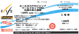 1本目が終わり、2本目スタート直前に2本目スタートリストをもらい、いつもの応援場所(K点付近真横)に戻ると、FISの関係者が我々応援しているところに来ていました。なにやらホームページでW杯の様子を紹介するとのこと。K点付近で選手の名前を連呼して応援している「札幌ノイズチーム」の、とにかくジャンプをこよなく愛しているリーダーとのツーショットで記念撮影をしてもらいました。たまたま、会場に長野五輪のときに着用していた「ヅラ」が非常に気に入ったらしく、「帽子交換」をして、FISの方はヅラをかぶったまま、ここを立ち去ったのでした(^^)(非常に似合ってます(^^))。ちなみに、ホームページアドレスは以下のとおりです。