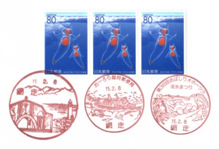 | 9:40 | 網走局到着。「第38回あばしりオホーツク流氷まつり」と「おーろら臨時郵便局」の小型印2種類、そして流氷が描かれている風景印の3種類を記念押印する。用意していた切手が「雪世界」の「流氷」50円切手と「流氷の天使クリオネ」80円切手の2種類で、このほかに流氷の描いた切手が「ゴマフアザラシ」80円切手と「北の鳥たち」の「オオワシ」50円切手もあるのですが、ゆうゆう窓口にはふるさと切手は用意されておらず、使うことができず。臨時郵便局ではいろんなふるさと切手は用意しているけど、ゆうゆう窓口にこそいつでもふるさと切手を買えるように用意してほしいですよね。なお、網走局の郵便窓口はゆうゆう窓口を含めると24時間営業局。局前ポストの最終取集時刻が23時45分。実際にその取り集めをしてすぐの運送便はないでしょうが、当日消印対応がこれだけ遅くの投函まで対応しているのはとてもいいことです。 |