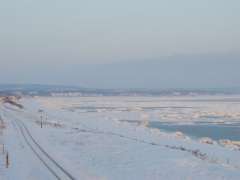 | 6:57 | 北浜駅到着。すぐに北浜駅ホーム沿いにある展望台に上り、日の出直後ということで、朝焼けをバックに列車が発車するところをデジカメ撮影する(左側はオホーツク海)。そして、網走駅方面の線路といっしょに、接岸しているオホーツク海の流氷を撮影する。 |