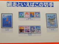 | 7:42 | 乗船手続をしたあと、余裕ができたので、おーろらターミナル内を探索したところ、網走局の「おーろら臨時郵便局」の看板とワゴンがありましたが、さすがに朝早くはまだ営業してませんでした。で、看板中央に「網走といえばこの切手」ということで、ふるさと切手北海道版の「クリオネ」(左)、「ゴマフアザラシ」(右)、「雪世界」(上、4種連刷)は流氷が入っているのでわかるのですが、下の「雪世界II」はタイトルこそ「雪」とあるものの、網走には関係ないような…(釧路、小樽、札幌、函館ですね)。どうせなら、流氷がバックの「オオワシ」切手が入っている「北の鳥たち」の方がふさわしいですね。 |