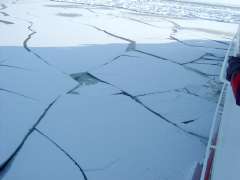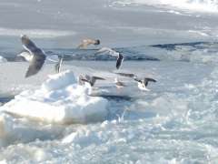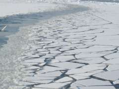 | 8:20 | 出航して15分。やっと流氷群に到着。今日としては最初の「おーろら」号出航なので、フレッシュな流氷を割っていく。 |