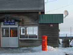 | 7:00 | 昨年9月のときにも撮影した北浜駅前の丸形ポスト、今回も撮影する。もちろん、ポストと流氷が見えるようなアングルでも撮影する(右、駅舎の窓越しにも流氷が見えます!)。 |