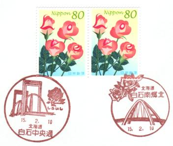 バラ切手は札幌市白石区の区花がバラなので、バラの風景印を使用している局のうち、白石南郷北局と白石中央通局で記念押印しました。