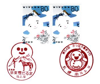 雪だるま切手は、ちょうどタイミング良く「第54回さっぽろ雪まつり」開催期間中ということで、雪まつり真駒内会場内の札幌南局臨時郵便局にて同局小型印、そして臨時郵便局には毎年恒例で早来雪だるま局の風景印が用意されているので、押印してきました。つまり、1箇所で2局(2種)の消印を押してきた次第です(^^;。雪だるま切手については、これ以上ないコンビネーションカバーですね(^^)。(2003.2.11提供)