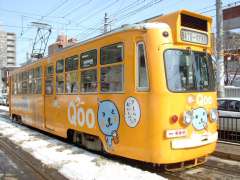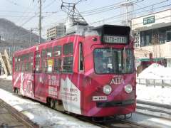 中央図書館前電停で西4丁目行電車を待っていたら、すすきの方面行の札幌アルタ広告電車通り過ぎようとしていたので、デジカメ撮影する。 |