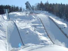 ジャンプ会場のピアシリスキー場に到着。2ヶ月ぶりの名寄です。試合はシャンツェ右側のノーマルヒル(K=90m)で行われます(写真は試合終了後に撮影)。既に試技が始まっていました。 |