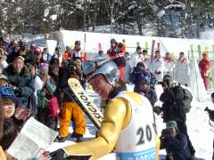 その次はいよいよ成年B組。1本目同点トップの岡部選手と原田選手の一騎打ち。先に飛ぶ岡部選手は大きく飛んで、原田選手にプレッシャーをかけたいところ。飛距離は93.5mとK点超えジャンプだったものの、着地でテレマークを完全に決めることができず、飛型点は減点。これで、原田選手はテレマークが入らなくても94m以上飛べば優勝とだいぶ楽な展開に。 そして、いよいよ原田選手の番となり、場内も大声援。そして、1本目同様、100mに迫る大ジャンプ。飛距離は1本目よりもさらに50cm伸ばして97.5mのバッケンレコード。文句なしの優勝。原田選手もシーズン序盤は不振でしたが、これで今シーズン初優勝。バッケンレコードのジャンプで完全復活です!優勝後、観客からは握手攻めで、原田選手も「原田スマイル」で応えてました。 |
