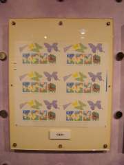 切手関係のいろんな展示がしていて、重ね刷りの行程についても昆虫シリーズの蝶小型シートを例に掲示されていました。 |