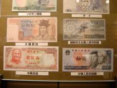 入口には現在の日本の紙幣に登場している4人の人物(福沢諭吉(1万円札)、新渡戸稲造(5千円札)、紫式部(2千円札)、夏目漱石(千円札)といっしょに「記念撮影」(顔ハメ)することができます。来年になれば、新渡戸稲造と夏目漱石に代わって樋口一葉、野口英世になるんですね。撮るならいまのうちです(^^;。 |