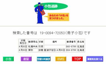 で、この日はひょうが降る大荒れの天気のため、仕事帰りに厚別局へ寄ることを断念したため、実逓便はまだ手にしていないのですが、ゆうびんホームページの「郵便追跡サービス」で追跡してみると、「冊子小包」として表示されてしまいました(^^;。本当の実逓便という証拠として、追跡状況を添付するという手がありますね。(2003.4.30提供)