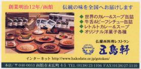 | 18:20 | 函館の老舗レストラン、五島軒の本店に行き、カレーバイキングでいろんなカレーを食べる。五島軒のマークがスズランの花2つの真ん中に「GOTOKEN」と書かれているのですが、中の白い部分が「〒」マークに見えてしまいます(^^;。 |
