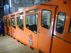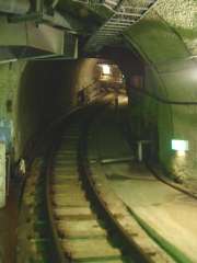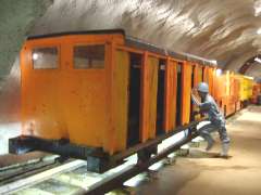 体験坑道の車両が発車する。発車前には危険防止のために閉められた入口が開けられる。体験坑道駅から青函トンネル記念館へ向かう登りは所要時間5分ですが、下りは逆に危険防止のため、スピードを出すことができないため、所要時間7分です。 |