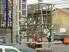6:08・ホテル前に弘南バスの観光バスが到着し、乗り込む。途中、市内のいろんなホテル前に停車して、次々と乗客が乗り込み、満席となって補助イスを使うほどの人気振り。土手町付近を通ったとき、ミスタードーナツを発見。あとで寄ろうと決意(^^)。そのあと、弘前ねぷたの骨組みを運んでいるところを見かける。ねぷたまつりもあと1か月ちょっとですので、準備が忙しくなる頃ですね。 |