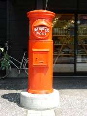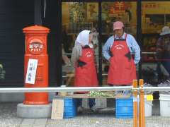 7:00・弘前公園内のガイドによる観光案内も終了し、弘前公園の北東にある「津軽藩ねぷた村」での朝市を体験。その中にある「アンテナショップ弘前」の前に丸形ポストがあるのですが、朝市をやっている方の名前紹介を丸形ポストに貼っている方がいました(^^;。 |