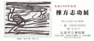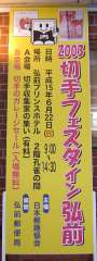 私の方は、ガレージの出店があるため、「切手収集家の集い」はほとんど参加できず。途中、弘前局臨時郵便局で風景印と「2003切手フェスタイン弘前」小型印を記念押印。で、サザエさんの絵入り葉書を買おうとしたら、局の在庫はほとんどなく、大半を「津軽村ねぷた村」の販売用として占められてしまったとのこと。朝に買うんだった(^^;。なお、今日押した風景印ですが、弘前城の右側は桜とはっきりわかりますが、昨日押したのはインクがつまっていて、桜かどうか全くわからない状態(^^;。 |