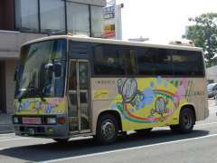 このあと、文化センター前バス停に戻るも、100円バスは待ってもなかなか来ず…。おおむね10分おきの運行も、結局20分近く待つハメに(^^;。100円バスの車体には100円玉が走り回っているところが描かれています(^^)。 |
