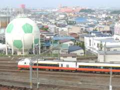 結局、会場に戻ったのは14時前で、ほぼ終了間近(^^;。「切手収集家の集い」、「切手のガレージセール」も大盛況のうちに終了。今日の夜も弘前に止まる友人の部屋で一時、休憩。参加者の一部は16:09弘前発・八戸行の特急つがるに乗って、八戸から東北新幹線はやてに乗って東京に戻る方がいるので、ホテルの窓から特急を見送る。ガス貯蔵タンクでサッカーボール塗装がバックにありました(^^)。 |