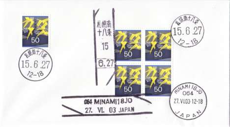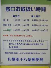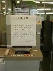 まずは振込用紙による振込み、ゆうちょキャッシュカードによる引き出しをして、そのあと50円・100円定額小為替発行による為替印入手、100円貯金、廃止用通帳への1000円貯金、1枚証書による定額貯金をする。貯金が終わるちょっと前に、室蘭の友人が来局。貯金関係が終わったあとは、50円料金証紙(メータースタンプ)発行による私製葉書差し出しをして、郵便印の押印。のんびり作業をしていたので、すべて終わったのが14:50と1時間以上もかかる(^^;。局を出るとき、局長さんにも丁重にお礼をして「お疲れさまでした」と声をかけてきました。 |