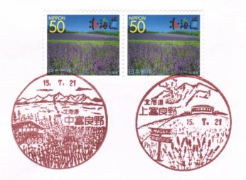 | 12:18 | 上富良野局到着。風景印を押印する。これで、ラベンダー風景印の2局印カバーの完成(^^)。 |