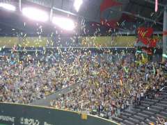 6回裏、横浜の攻撃。阪神・久保田投手は1死後、4番・ウッズ選手を三振に抑えて11奪三振。これで1アウトをとれば阪神のラッキーセブンというところで、阪神ファンは甲子園同様、ジェット風船を膨らまし始める。でも、ジェット風船は札幌ドームでは禁止なんですよね…。ま、ジェット風船のゴミのせいで、可動席が動かなくなって、試合中止ということにならなければいいのですが…(^^;。しかし、5番・佐伯選手は四球、6番・種田選手に死球と2死1・2塁のピンチ。7番・古木選手の打った打球は、ショート藤本選手がセンター前に抜けようかという当たりを取ったものの、内野安打。しかし、佐伯選手が3塁を回ってホームを狙おうとしたもの、あまりにも無謀。藤本選手が本塁に投げて、佐伯選手が三本間に挟まれて憤死。せっかくのチャンスを逸してしまう。