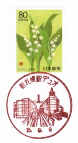 ●新札幌駅開業30周年…新札幌駅デュオ局風景印押印 新札幌駅が今日、9月9日で開業30周年を迎えたので、仕事が終わったあと、新札幌駅デュオ局に寄って、風景印を押してきました。なお、風景印に押した切手が「スズラン」なのは、新札幌駅に特急すずらん(札幌〜東室蘭間(東室蘭〜室蘭間は普通列車))が停車することにちなんでです(^^;。(2003.9.9提供)