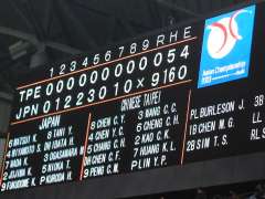 9回表・チャイニーズタイペイの攻撃。日本は3番手・黒田投手(広島)が登板。黒田投手は松坂・石井両投手を上回る時速153kmの直球を投げ込む。出てくる投手みんな球速が時速150km台では、相手にとって「スピード違反」「反則」ですよね(^^;。2死後、4番・5番打者連続ヒットを許す。4番打者はこの日3安打(チャイニーズタイペイはチームで5安打)とひとり気を吐く。しかし、6番打者をセカンドゴロで抑えてゲームセット。日本が9−0の圧勝です。