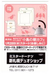なお、昨年末に行われたキャンペーンのときに次のキャンペーンが「毎日おうちでカフェ気分 小鳥の朝カフェ」で、期間が2004年1月7日(水)〜2月1日(日)と予告されていましたが、「小猫の昼カフェ」に変更、期間も変更(1週間短縮)となっています。「小鳥の朝カフェ」キャンペーンは「小猫の昼カフェ」の次に行われ、スタートは1月28日(水)からです。よって、前回のキャンペーンと今回のキャンペーンの次回予告はスタート日(7日→28日)だけ変更で、あとはすべて同じです(^^;。