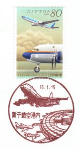 新千歳空港に到着後、新千歳空港内局で風景印押印。風景印が新調していて、日付部の間隔がそれまで使用のと比べて狭くなっています。