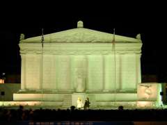 ●7丁目会場 「復元・バルテノン神殿」(大雪像) 高さ14m 幅26m 奥行き20m 2004年夏に開催されるアテネオリンピックにちなみ、バルテノン宮殿を大雪像で制作。ギリシャ彫刻の最高傑作とされる屋根下の神々の群像彫刻も再現 |