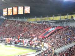 試合開始前、選手入場の際、ホームゴール裏では背番号「12」の巨大ユニフォーム形ビッグフラッグが登場。ホーム側はほぼ満員ですが、ほかは空席が目立つ状態(^^;。 |