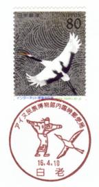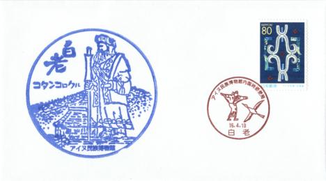 白老局のゆうゆう窓口で風景印と「アイヌ民族博物館臨時郵便局」小型印を記念押印。アイヌ民族博物館臨時郵便局の営業時間は12〜16時で、このあと博物館に行く予定でしたが、そこでの押印はできないため、局で押印することになりました。小型印押印用の切手は「アイヌ文様」切手(北海道遺産)、小型印図案の「鶴の舞」にあわせて、いろんなタンチョウの切手を用意しました。先日死去したばかりの加山又造氏原画の「インターネット博覧会」切手(飛翔)が小型印にピッタリですね(^^)。9:00・押印終了。 |