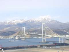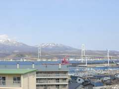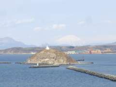 11:53・室蘭産業会館前バス停から道南バス・絵鞆団地行バスに乗り、12:07・絵鞆団地バス停で下車(運賃240円)。5分歩き、12:12・絵鞆岬(室蘭八景)に到着。白鳥大橋はもちろん、この日は駒ヶ岳、大黒島の向こうの羊蹄山も望めました(^^)。 |