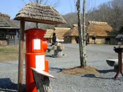 10:15・博物館を出る。出たあと、3年前のときにあった丸形ポストの位置をデジカメ撮影。3年前にあったポストはもちろんポロトコタン内(アイヌ民族博物館前)に移設しているため、今はありません。(2004.4.13提供) |
