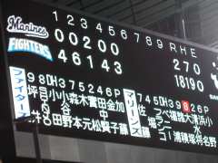 【2回裏】北海道日本ハムの攻撃。9番・金子選手が四球で出塁すると、1死後、2番・SHINJO選手が左中間へ7号・2ランホームラン!北海道日本ハム6−0と試合の主導権を完全に握る。そのあと3番・小田選手がライト前ヒット、4番・セギノール選手がライトオーバーのヒットで1死1・3塁。5番・エチュバリア選手が三遊間へのゴロ。ショートがなんとか取って、セカンドはフォースアウトするも、ファーストはセーフとなり、3塁ランナーが生還し、7−0。6番・木元選手はレフトで大きな当たり。レフト・フランコ選手はいったん前進したため、打球は頭の上を越してしまい、さらにクッションボールが頭の上を越してしまうダブルチョンボで1塁走者が生還し、8−0。7番・高橋信選手は死球で2死1・2塁となり、8番・田中賢選手が右中間を破る2塁打。2走者が生還して、2回にして10点と2桁得点(^^)。