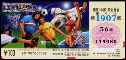 ●関・中・東北自治宝くじ「彩の国まごころ国体」を購入 地下鉄新さっぽろ駅のキヨスクで今年・2004年開催の第59回国民体育大会夏・秋季大会「彩の国まごころ国体」の関東・中部・東北自治宝くじ(1枚100円)を買いました。バスケットボール、サッカー、野球、柔道、水泳、そして国体マスコット、シラコバトの「コバトン」が入っています。(2004.6.9提供)